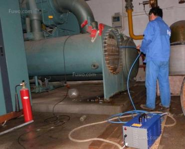 4、洗凈表冷器里層間隙內的灰塵后,用高壓霧化水噴吹,操作時應防止盤管鋁翅片折彎、變形,一邊噴吹一邊用吸塵器收集灰塵及污水;