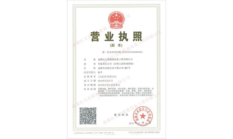 成都紅五星暖通設備工程有限公司營業(yè)執(zhí)照